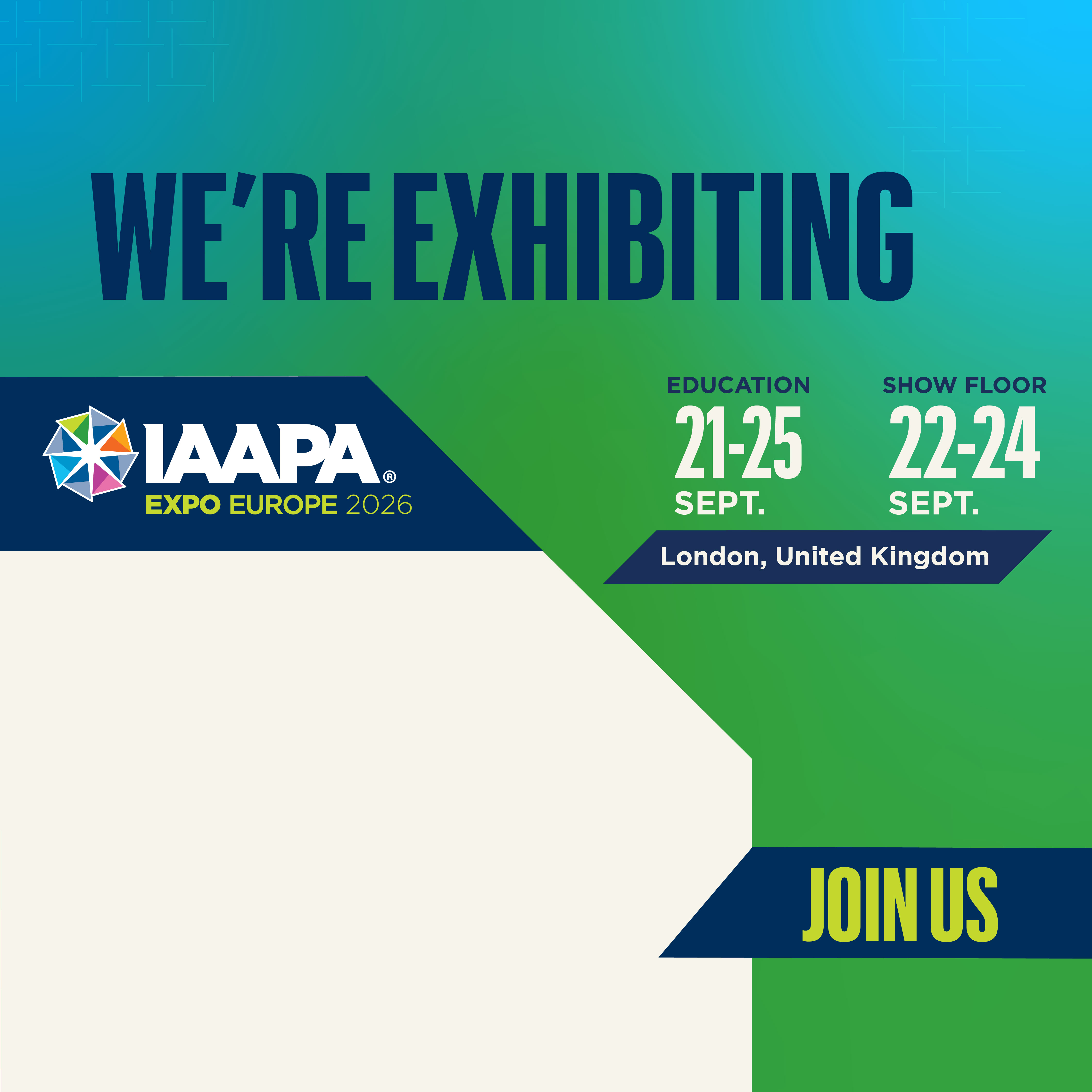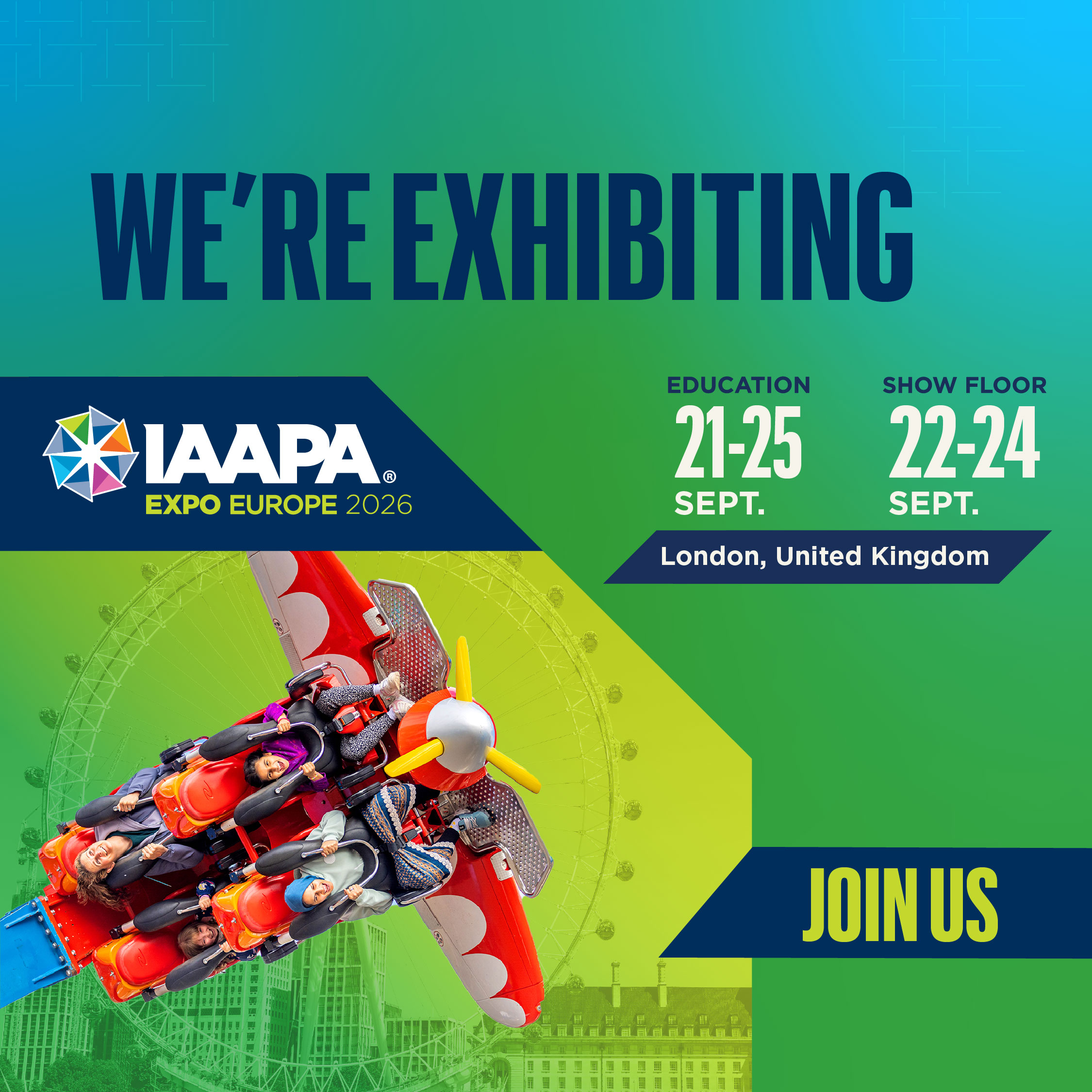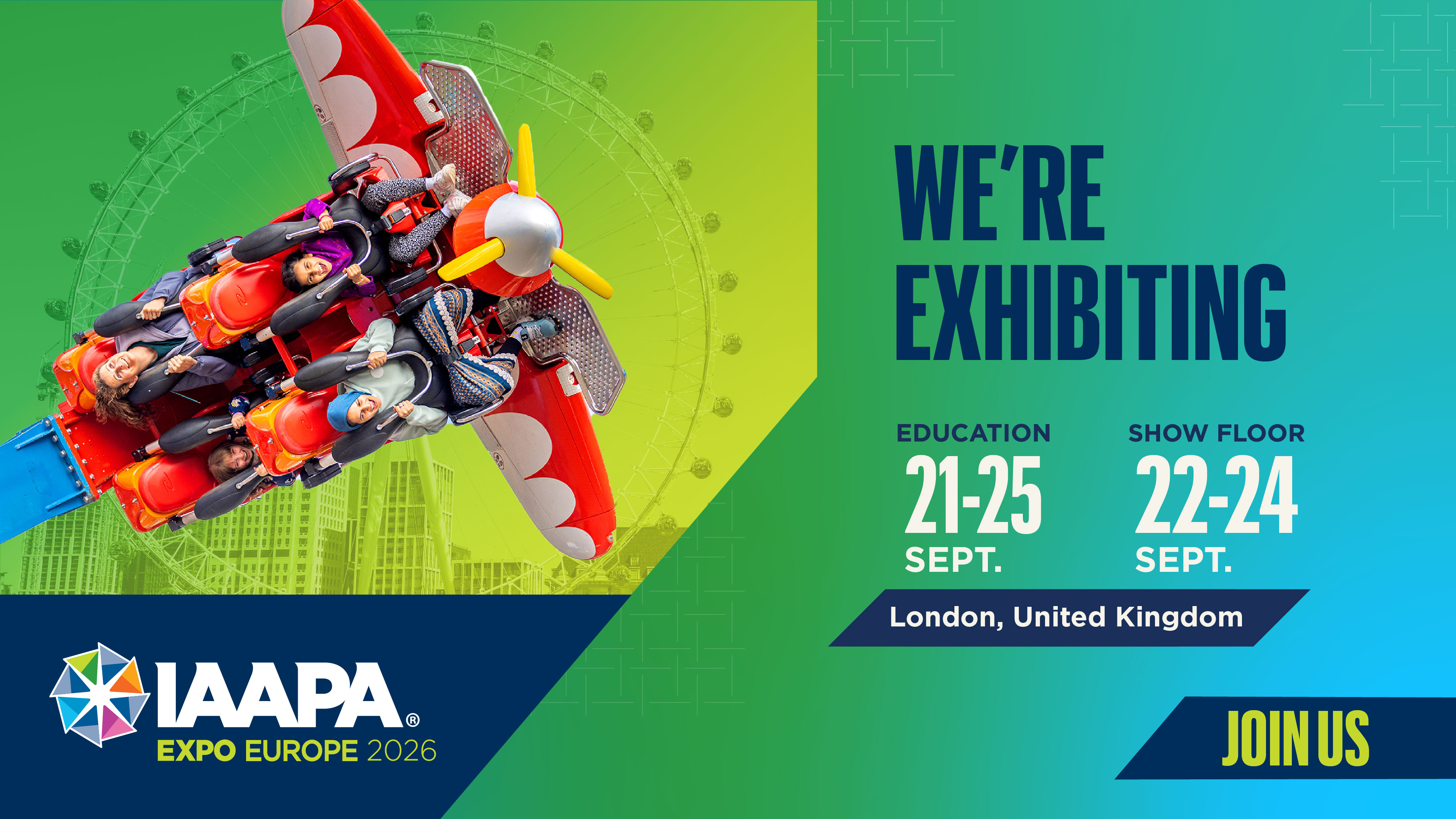 IAAPA Expo Europe 2026 is happening in London, UK, this September. Let’s meet in person at booth {number} for the largest trade show in Europe dedicated to the leisure industry. IAAPA.org/IAAPAExpoEurope #IAAPAExpos